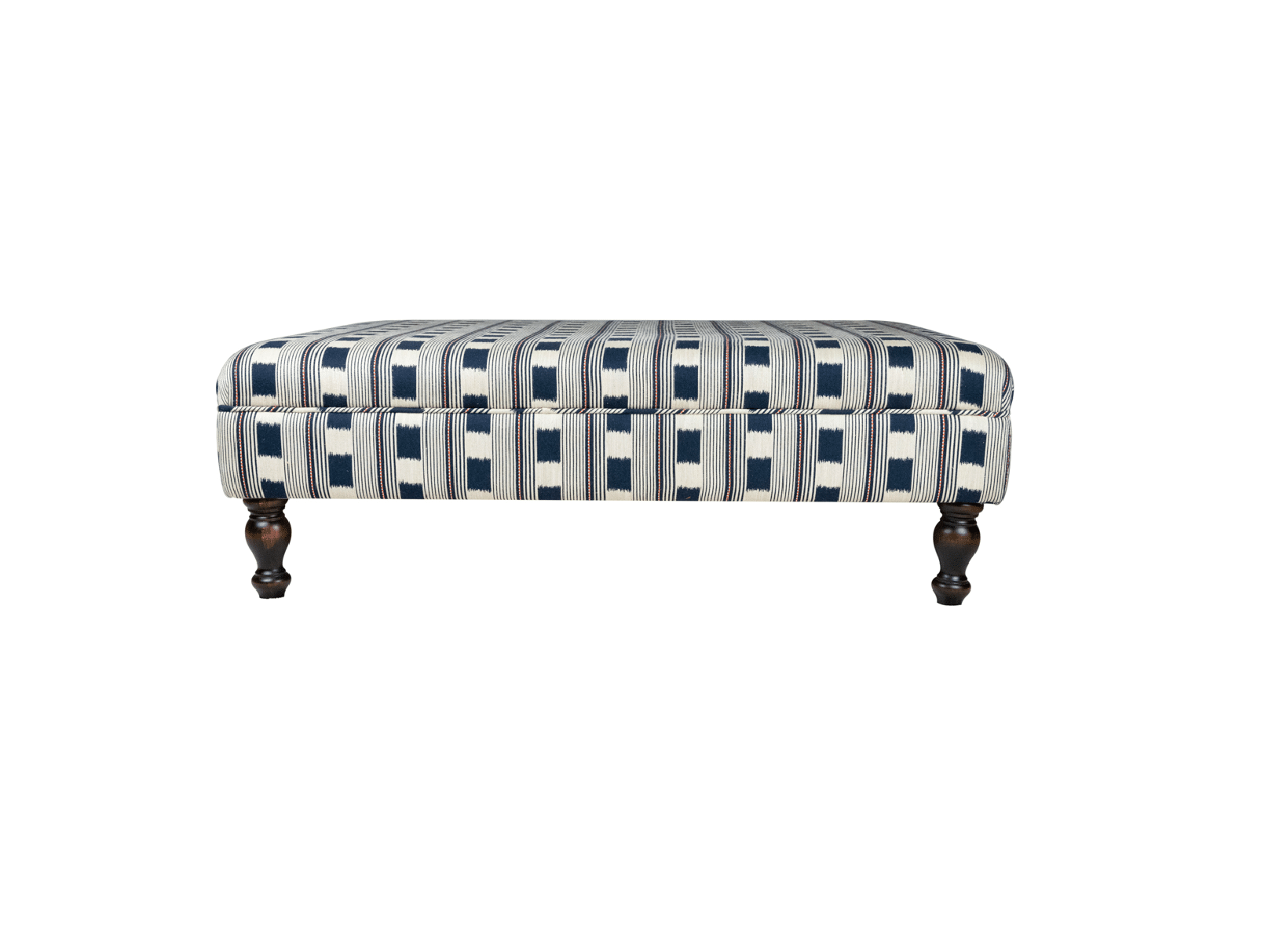 • A thick, durable woven fabric in a linear ikat pattern, from iconic designer Kit Kemp for Christopher Farr. These ottomans are lovingly designed and made exclusively in Cork. The hand turned wooden legs are treated with a dark stain to give a contemporary twist to a traditional look.